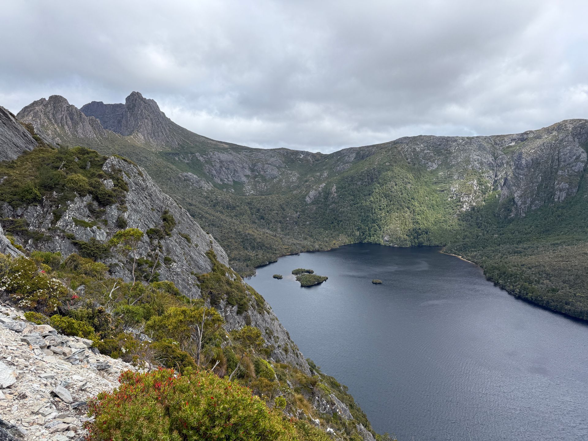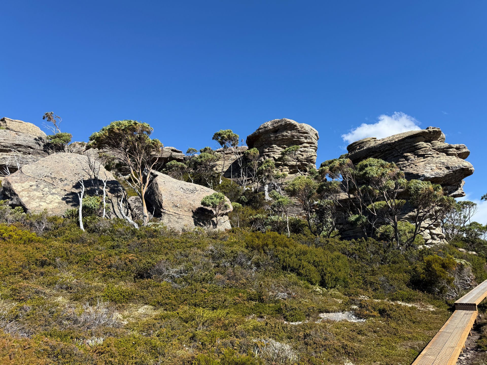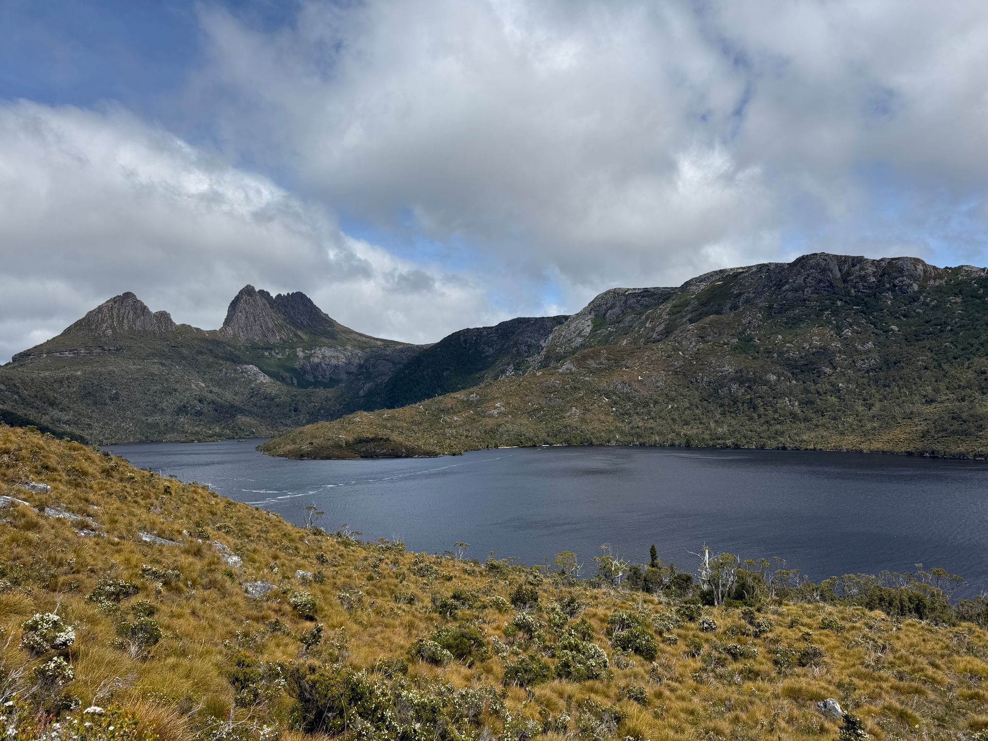 Up next was Cradle Mountain. The most popular National Park in Tassie. And after a short bus ride from the Visitor Center, you can quickly see why. Dramatic mountainscapes, alpine lakes, wombats. The trifecta. It’s also the start of the Overland Track, Tasmania’s most popular backpacking route. I did a hike around some of the peaks above Dove Lake and under Cradle Mountain itself. There were seriously cool rocks and cliffs, a serene rainforest section, lovely waterfront picnic areas, steep steps, panoramic vistas, pristine lakes, wide open moorlands, and wombats! It was probably my most joy-filled hike of the trip. So many microclimates and different times of views. Lots of tourists looking happy to be alive despite my enthusiastic, sweaty grins as I rushed by them. If I were to have any regrets on this trip, and I don’t by the way, but if I did, it would be to spend more time in the Cradle area, hitting all of the hikes and walking the Overland Track. It’s really something special and requires a few solid days to see it all properly. I actually would have seen more, but I found that I had a perfect weather window to hike what was described to me as the best multi-day hike is Tasmania: The Walls of Jerusalem.