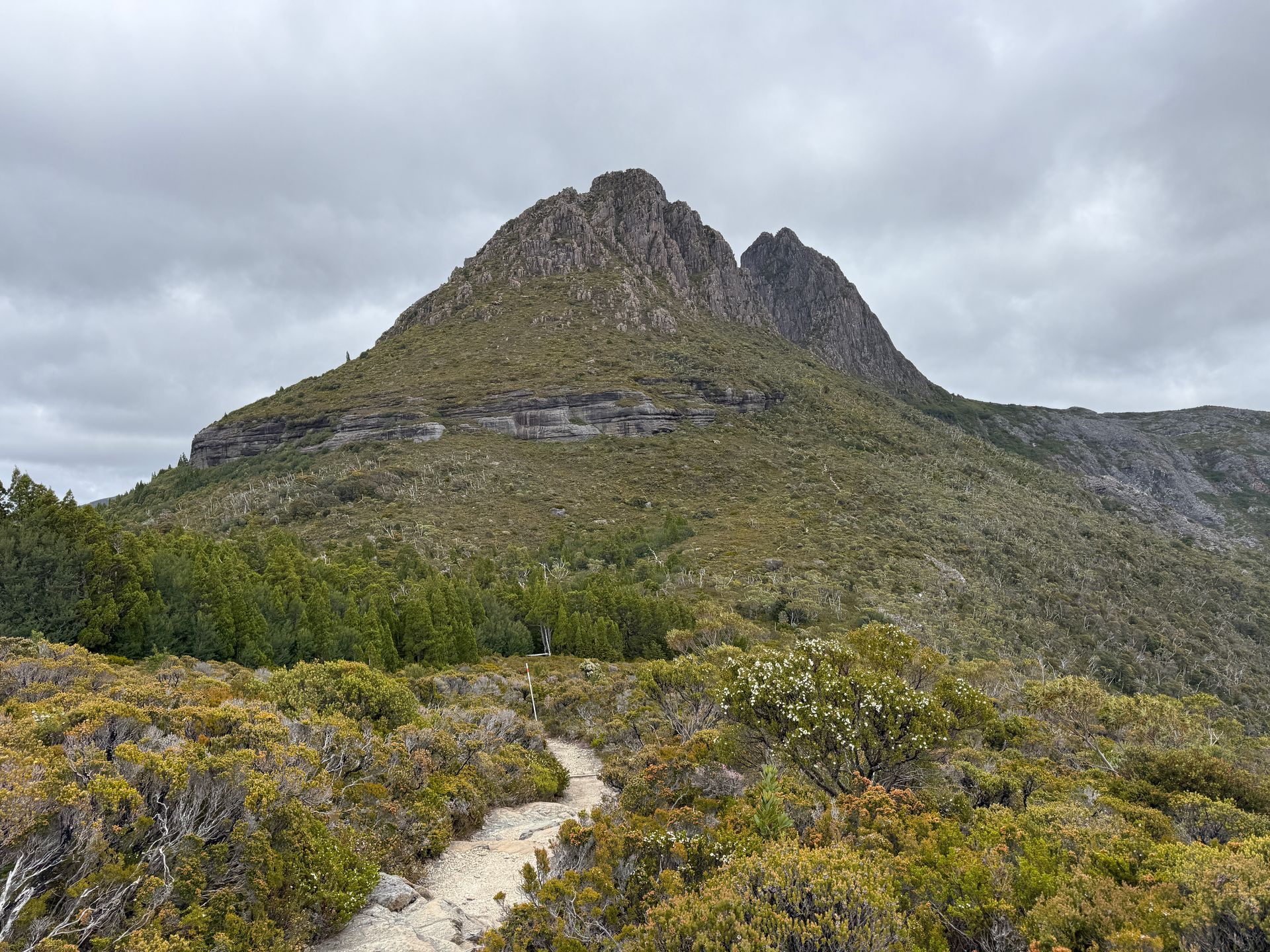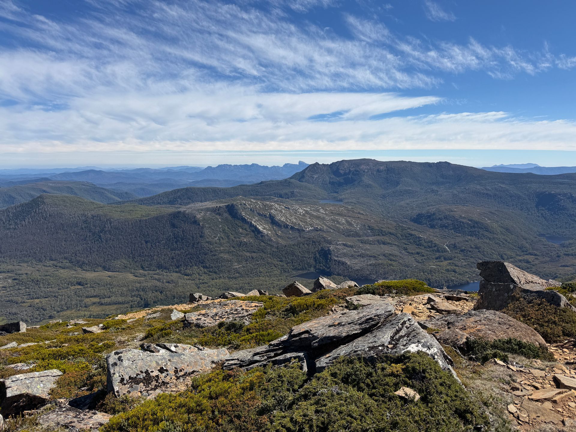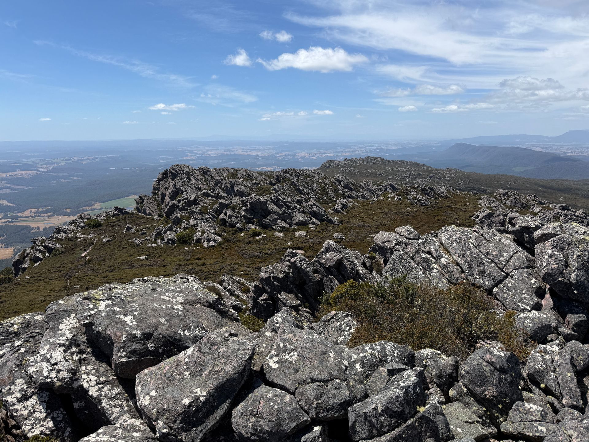 Mount Roland is a really quite impressive rock that sort of appears out of nowhere when you drive along the northern coast of Tasmania. I remember seeing it from afar back in December and thinking “wow I’ve love to be on top of that cool rock.” Well, turns out I was now a half hour away from it and it has a track for me to walk! (Sandie and Joe have a stupendous view of it from their yard too). It was a really amazing hike and an incredible view from the top. You can see Bass Straight, several of the places I camped and explored back in December, big mysterious mountains to the Southwest. Simply stunning. I’ve said it once and I’ll say it probably many more times, but I LOVE alpine regions. The little shrubby plants, the short gum trees, the tiny little flowers, the colorful lichen-covered rocks, it’s the stuff high elevation dreams are made of. Totally worth the blisters.